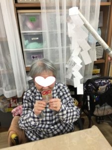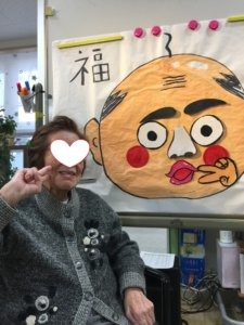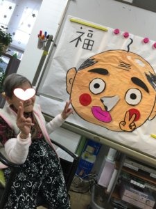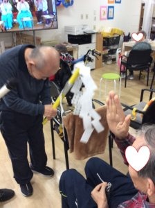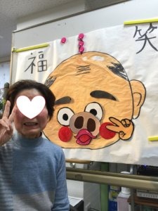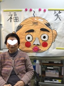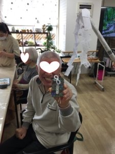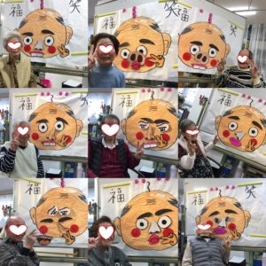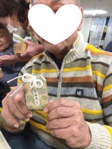 続きまして、正月と言えば昔懐かし福笑い!!と初めての試み・・・・? お昼のレクリエーションで・・ これもまた 毎年の恒例 「福笑い」でございます。 一部の方の写真ですが、 それぞれに・・・ 特色があって、 また 大変これも・・・盛り上がりました。 一月の工作は、こちら・・・ お守り作りでした。 この試みは初めてで、なかなか良いものが、 利用者様の中には、お布施?お玉串?を出そうと してくれはる方もいらっしゃいまして、 スタッフ 恐縮してしまいました。 ちょっと もったいない話ですが、 大幣(おおぬさ)をもって お祓いでございます。 ご覧頂き 有難うございます。 これもまた 桜の咲く時期に 1月の 話題でございます。