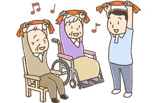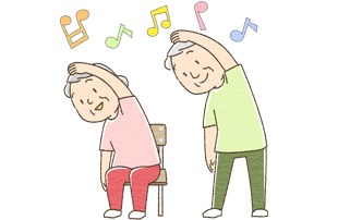 曲に合わせ、体を動かします。日替わりでお口の体操なども。心も体もリフレッシュしていただけます。